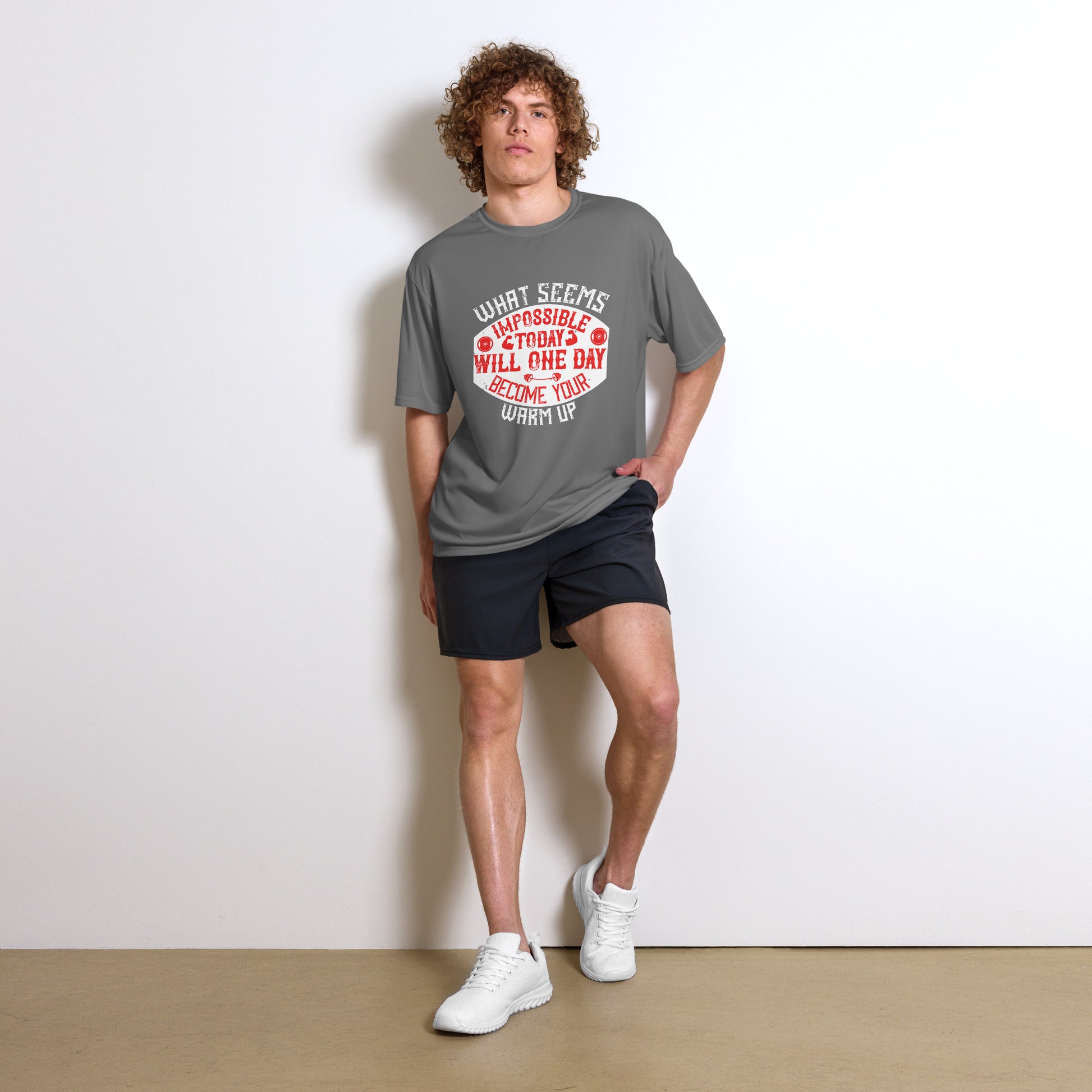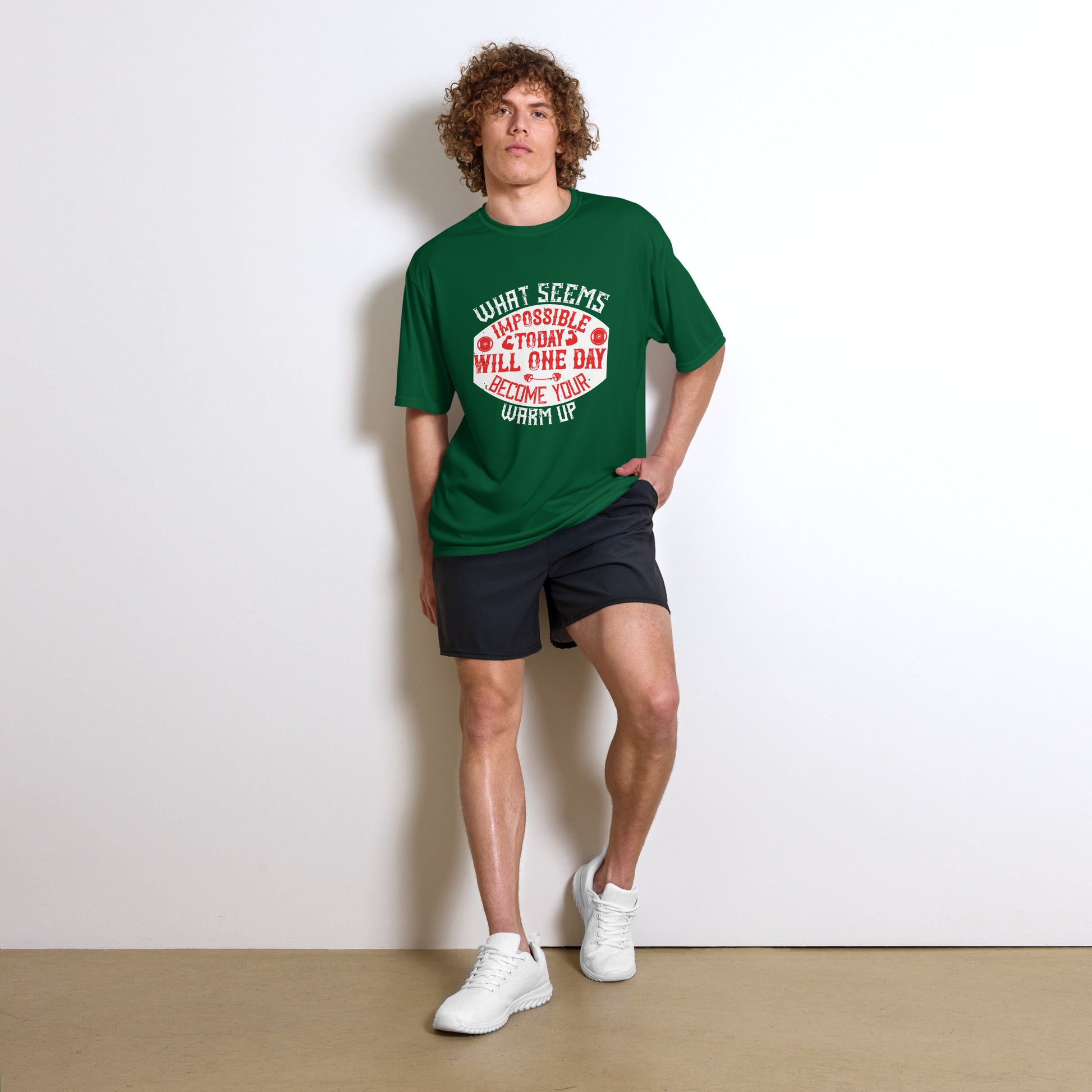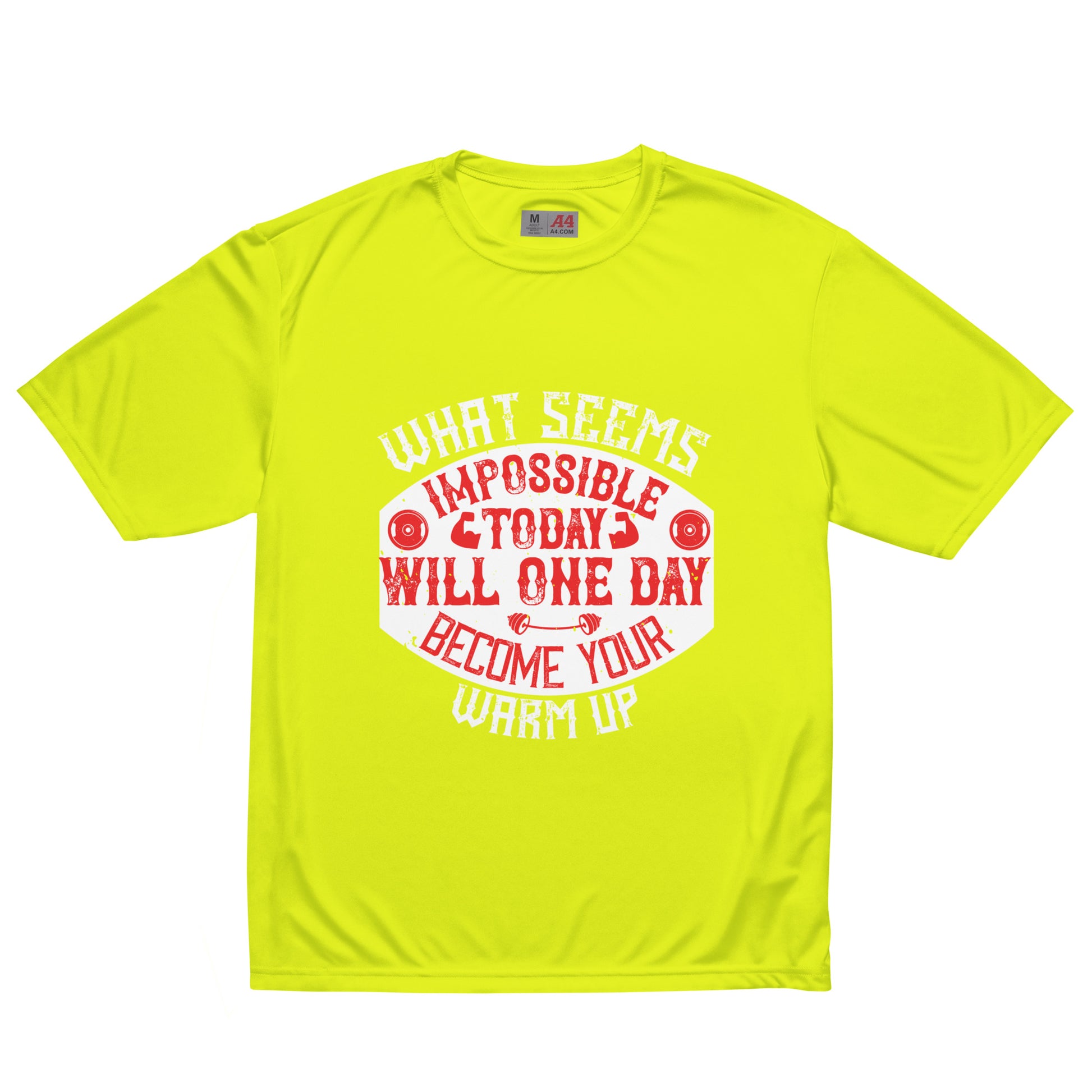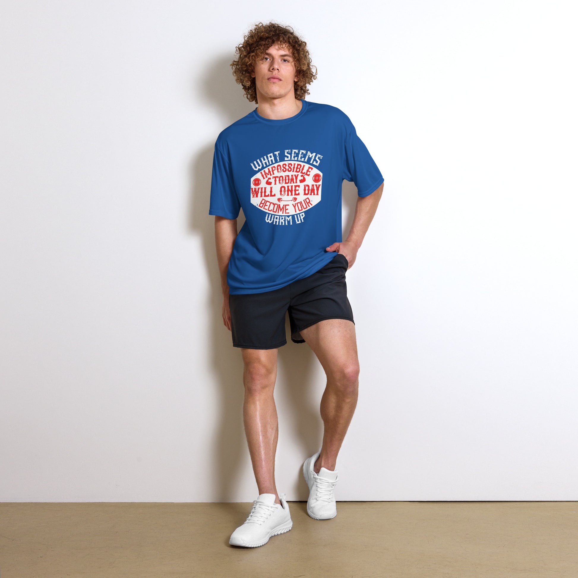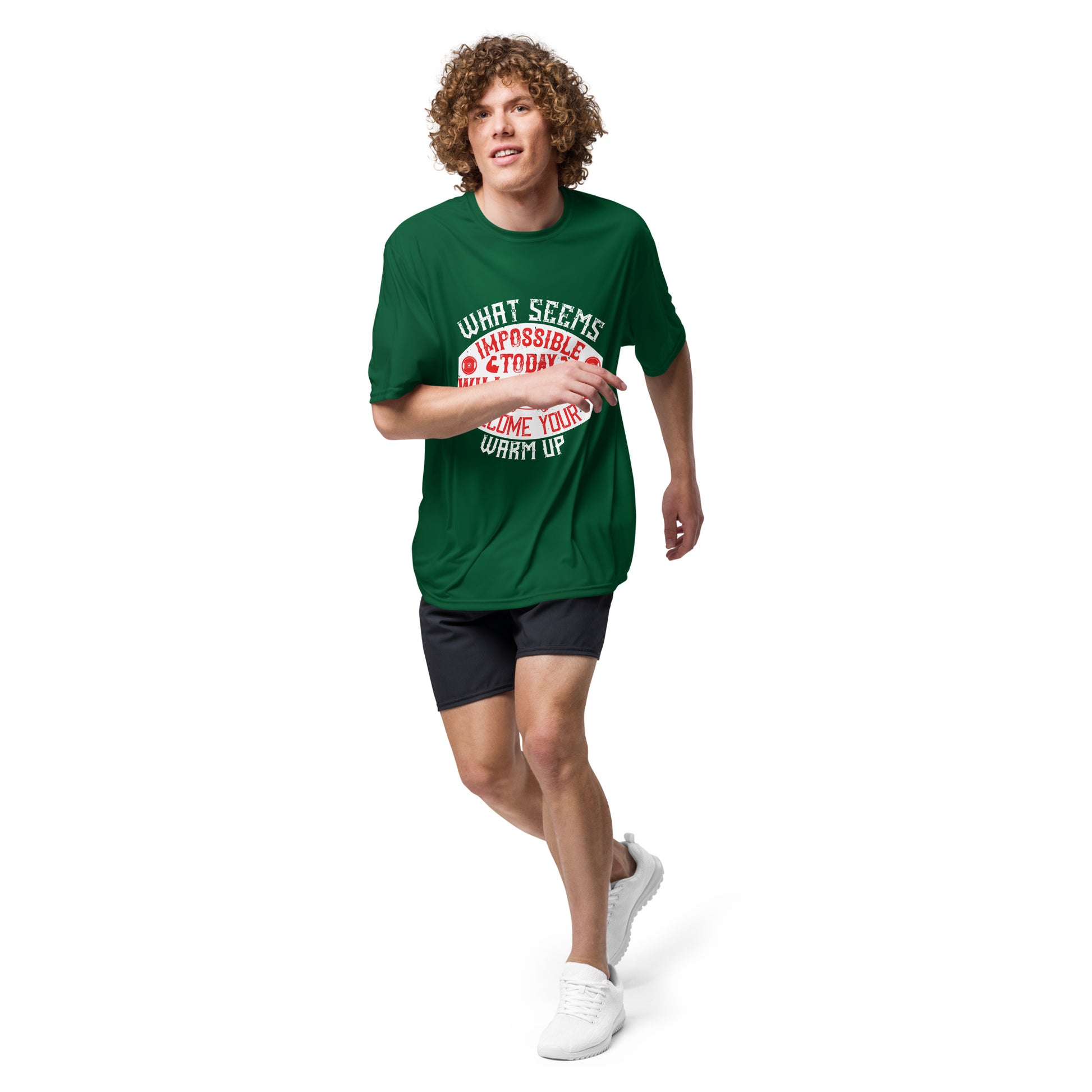Throw on our "Warm-Up Wisdom" Performance T-Shirt, and get fired up for the transformation that awaits! This isn't just a hoodie; it's a banner of progress, boldly proclaiming, "What seems impossible today will one day become your warm-up." Wrapped in the fiery red of passion and the resilience of a warrior, this statement circles you with the energy of a thousand workouts. It's designed for those who see each day not as an obstacle but as an opportunity, for the dreamers who dare to warm up with weights that others only dream of lifting. As comfortable as the confidence you'll feel when you crush your goals, this hoodie is for the relentless, the unstoppable, the ones who know that every impossible is just an 'I'm possible' in disguise. Stay cool, dry, and confident even during the most intense activities in this unisex performance crew neck t-shirt. Made from premium, moisture-wicking fabric with odor resistance, stain release, and UV protection, this shirt’s perfect for going to the gym, playing sports, hiking, or any other activity.