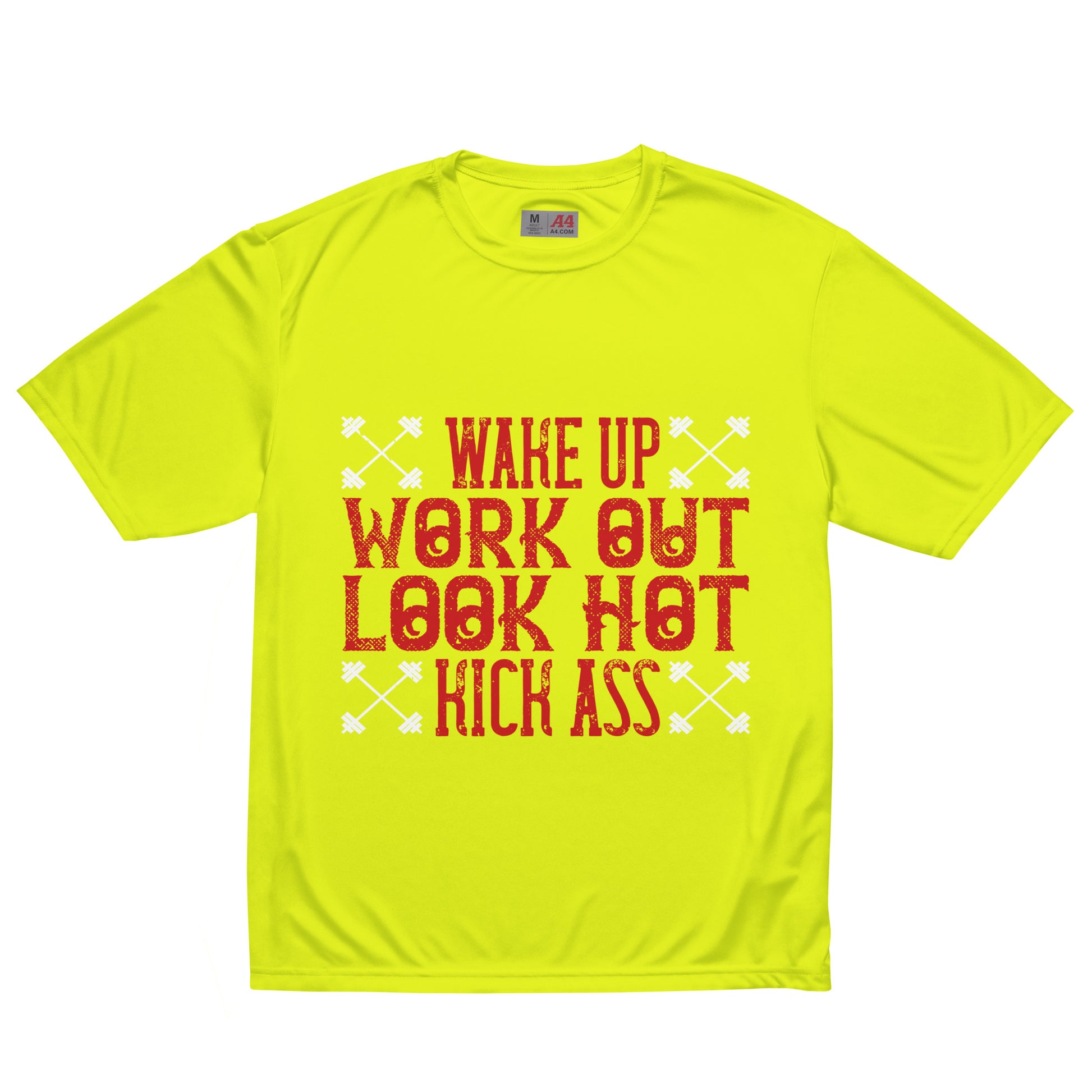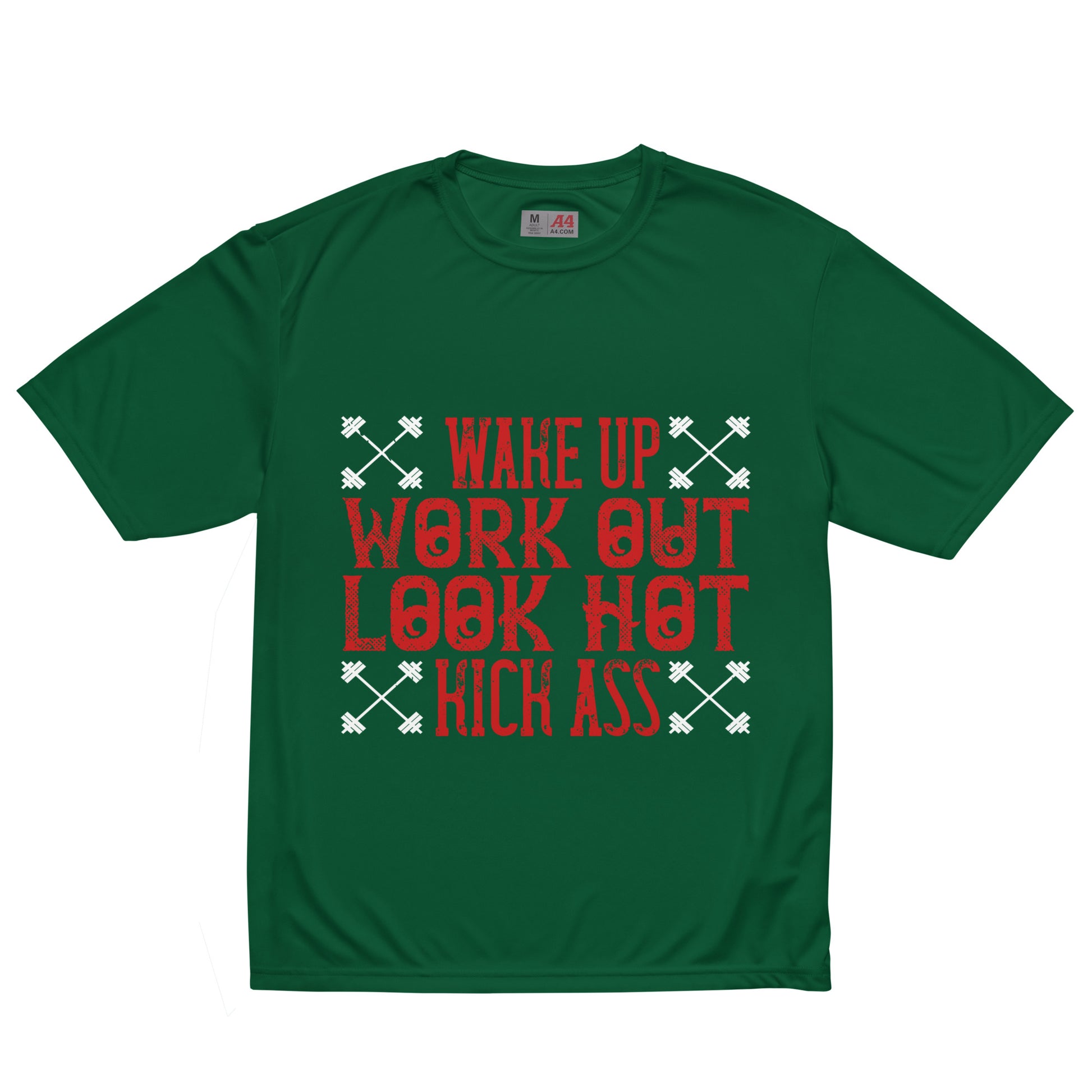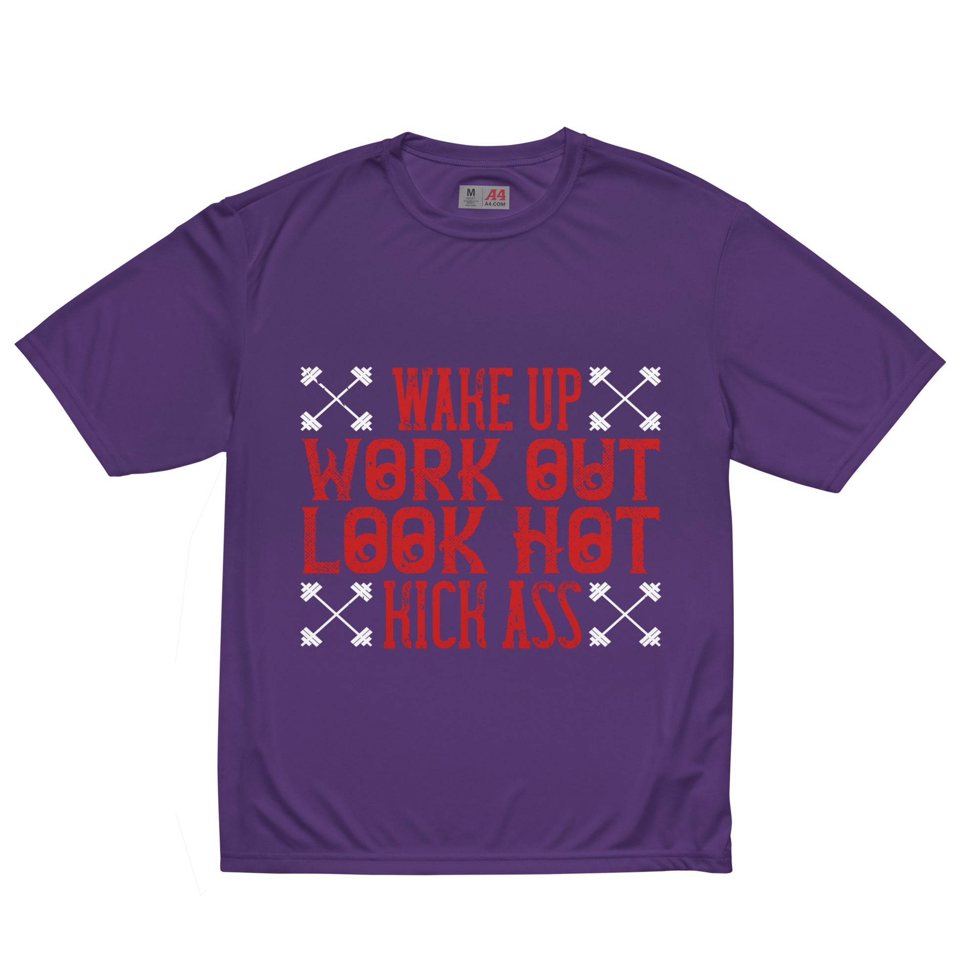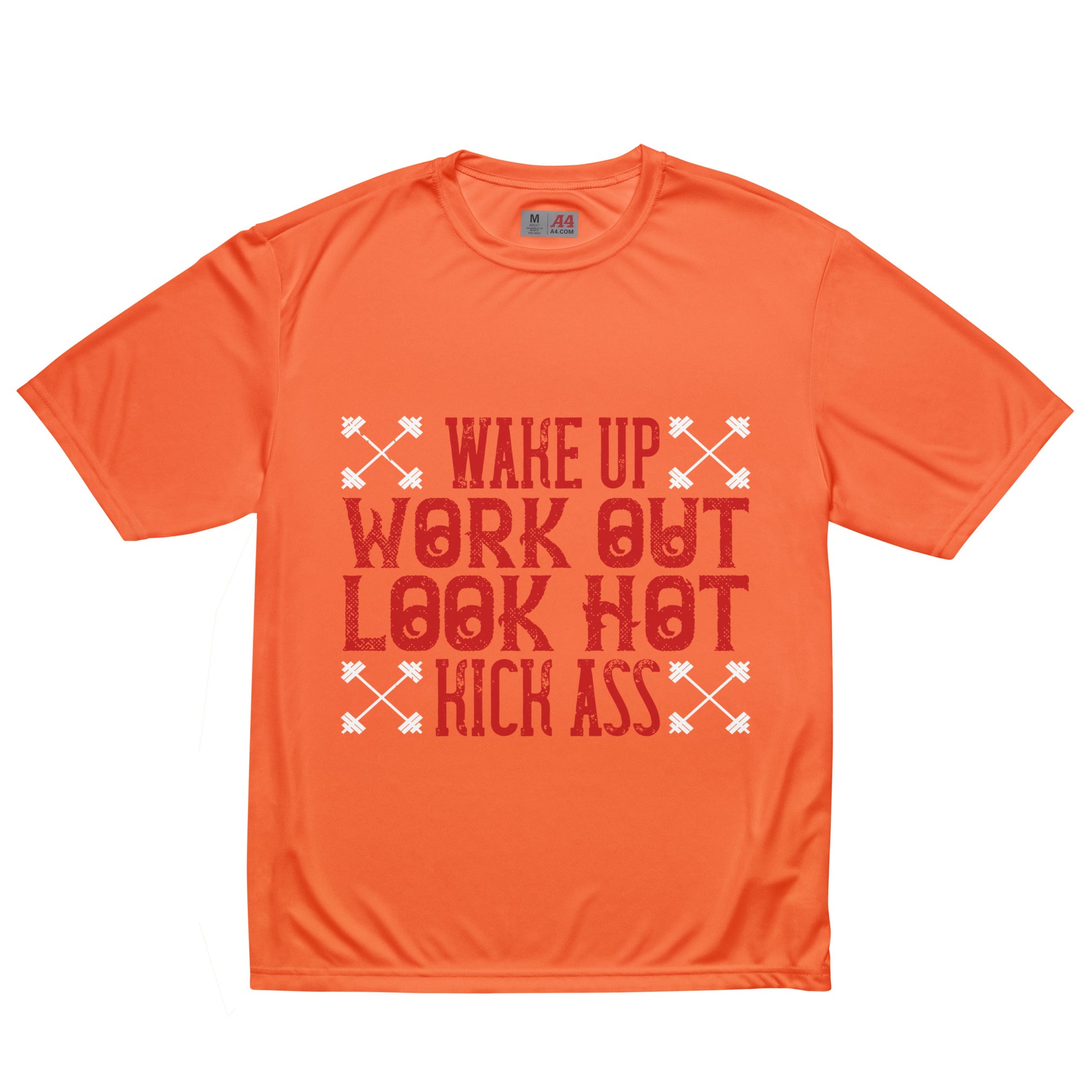 Power up your daily mantra with the "Work Out, Look Hot" Performance T-Shirt, a bold statement piece that lays out the blueprint for success: "Wake Up, Work Out, Look Hot, Kick Ass." Each word is a step on the staircase to your best self, etched in a font as fierce as your determination and in colors that pop against the sleek black background. This t-shirt isn't just for wearing—it's for declaring a lifestyle, a battle cry for those ready to take on the day with sweat, style, and swagger. Made for the movers and shakers, the trendsetters and the record breakers, it's your uniform for victory. Whether you're crushing it at the gym or conquering the concrete jungle, this tee is your ally, making sure you're not just going through the day—you're owning it. Stay cool, dry, and confident even during the most intense activities in this unisex performance crew neck t-shirt. Made from premium, moisture-wicking fabric with odor resistance, stain release, and UV protection, this shirt’s perfect for going to the gym, playing sports, hiking, or any other activity.