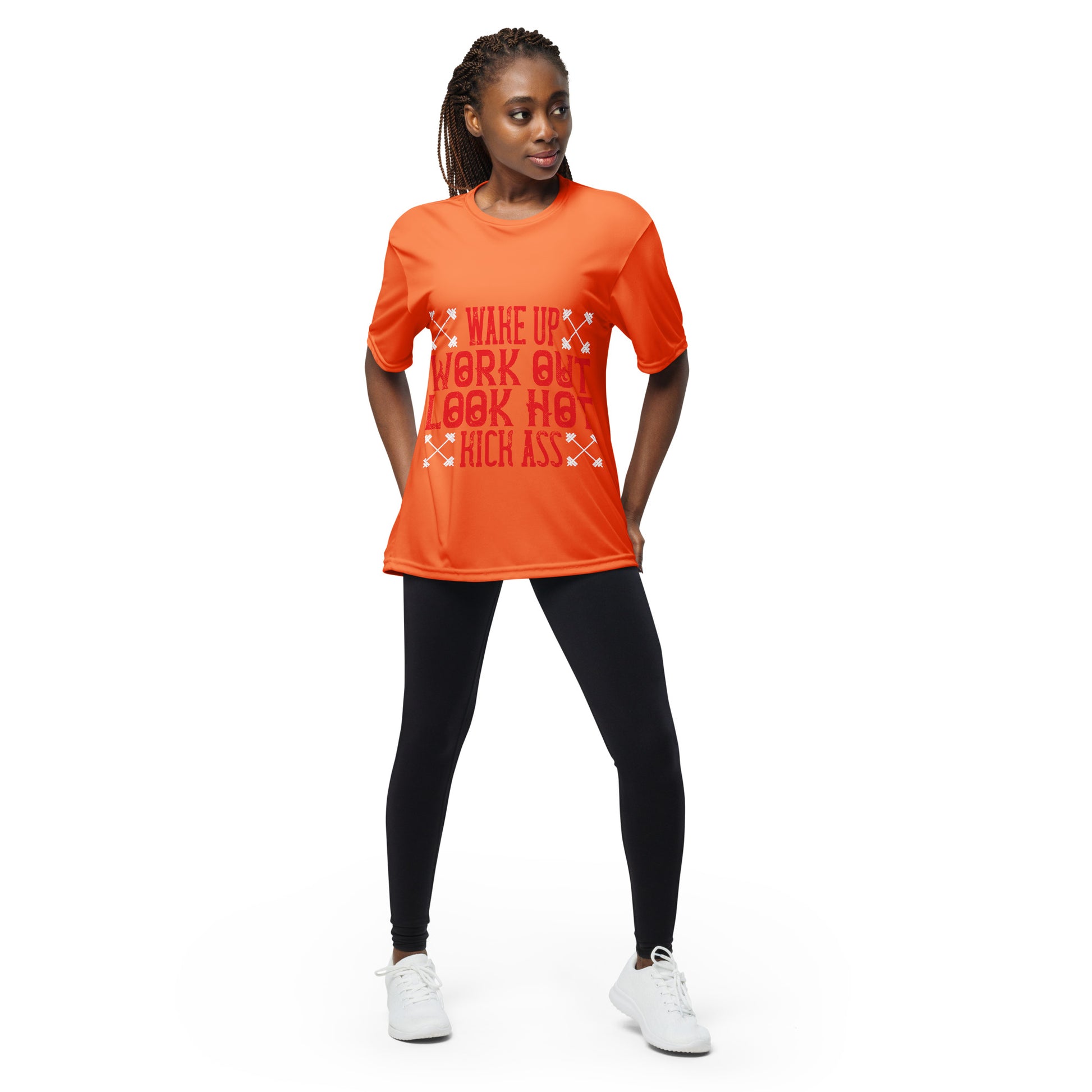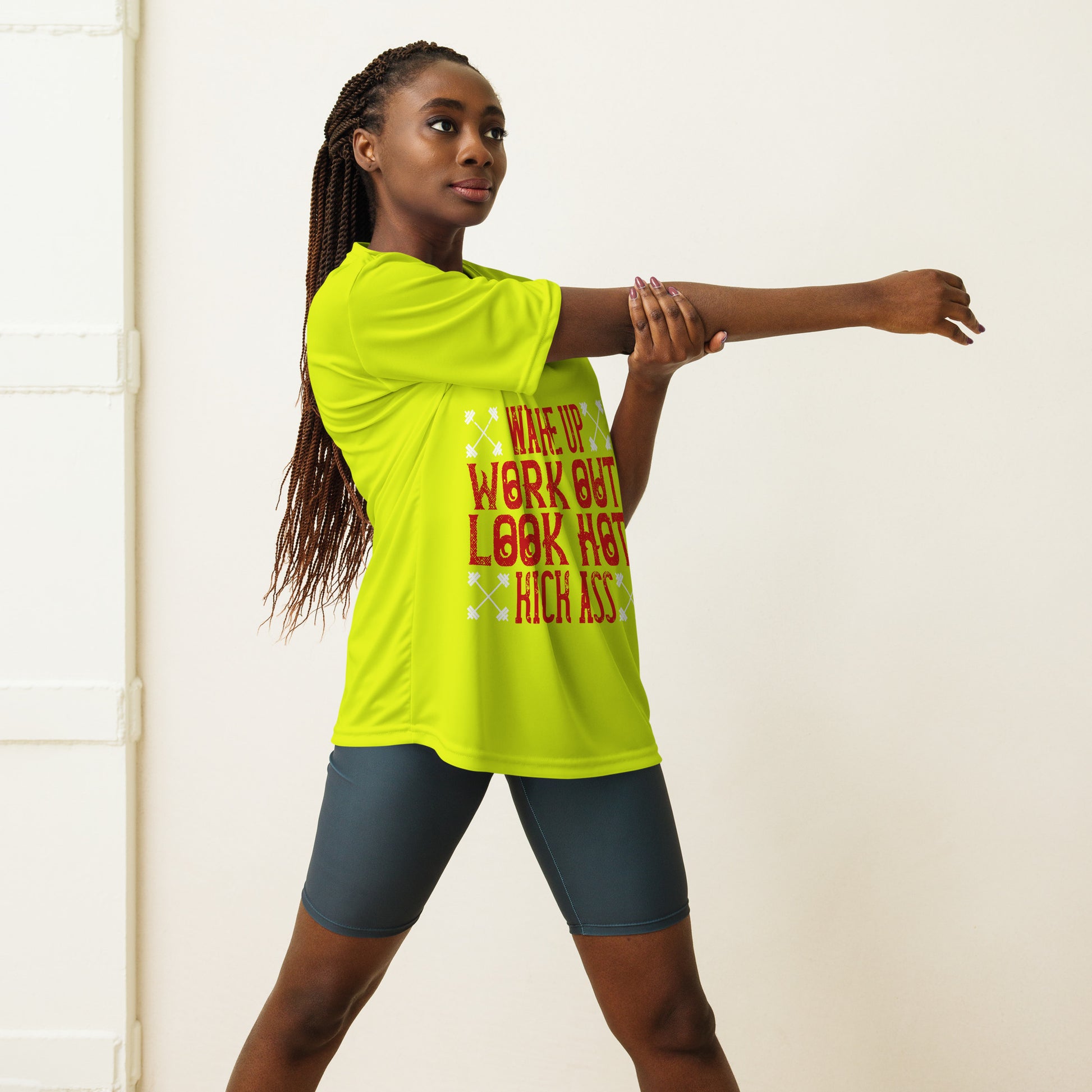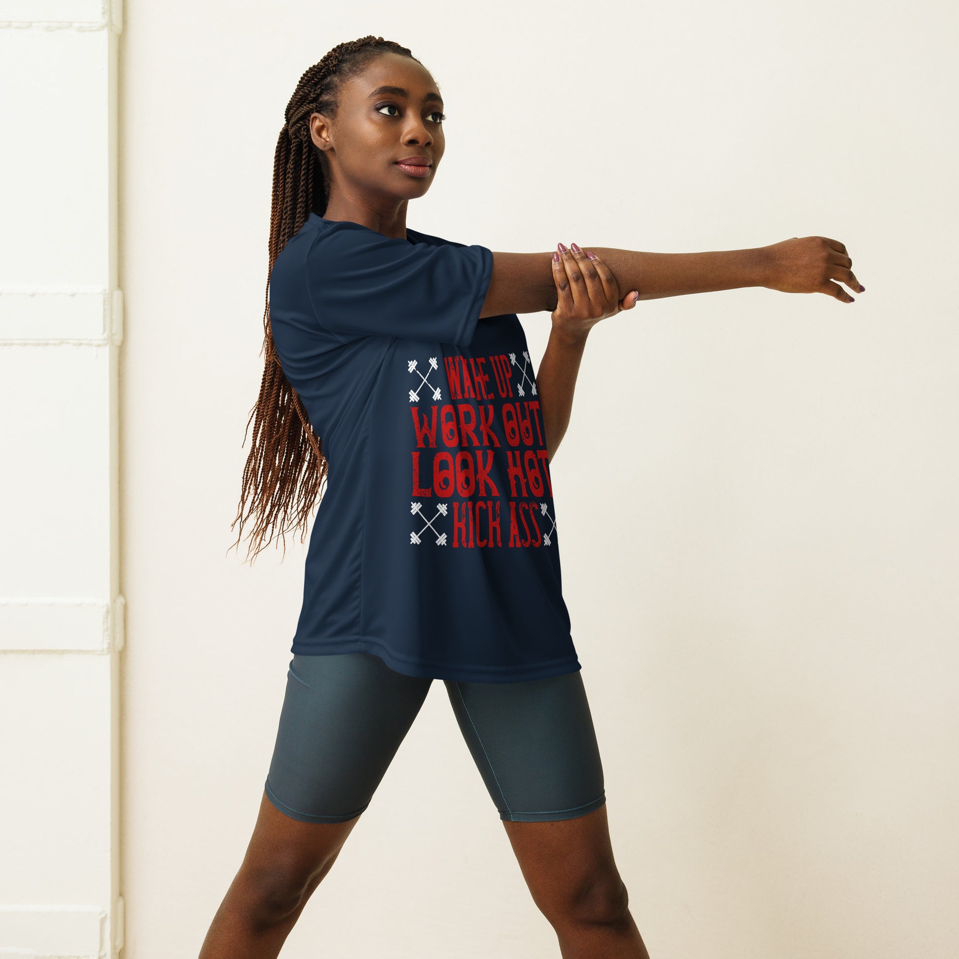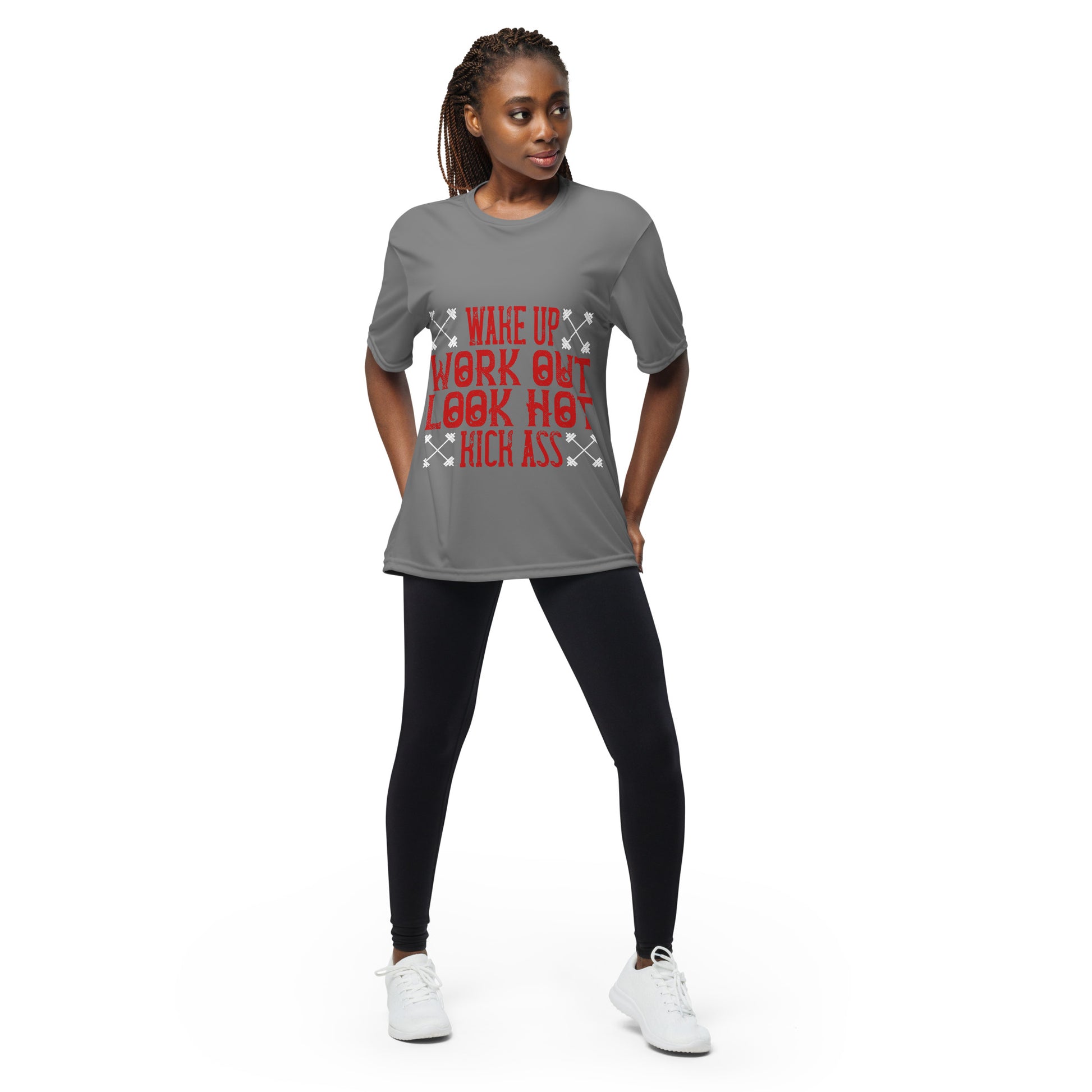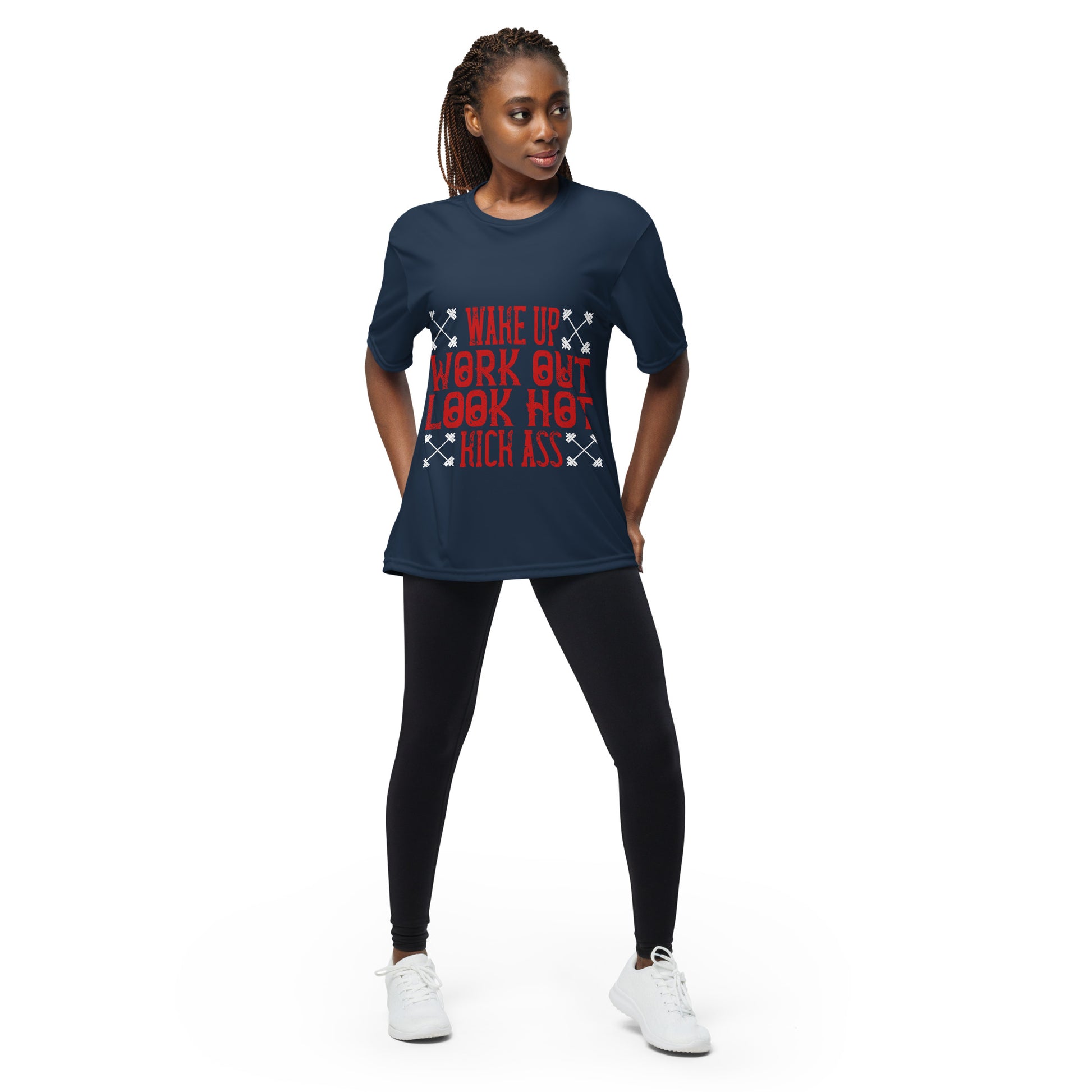 Power up your daily mantra with the "Work Out, Look Hot" Performance T-Shirt, a bold statement piece that lays out the blueprint for success: "Wake Up, Work Out, Look Hot, Kick Ass." Each word is a step on the staircase to your best self, etched in a font as fierce as your determination and in colors that pop against the sleek black background. This t-shirt isn't just for wearing—it's for declaring a lifestyle, a battle cry for those ready to take on the day with sweat, style, and swagger. Made for the movers and shakers, the trendsetters and the record breakers, it's your uniform for victory. Whether you're crushing it at the gym or conquering the concrete jungle, this tee is your ally, making sure you're not just going through the day—you're owning it. Stay cool, dry, and confident even during the most intense activities in this unisex performance crew neck t-shirt. Made from premium, moisture-wicking fabric with odor resistance, stain release, and UV protection, this shirt’s perfect for going to the gym, playing sports, hiking, or any other activity.