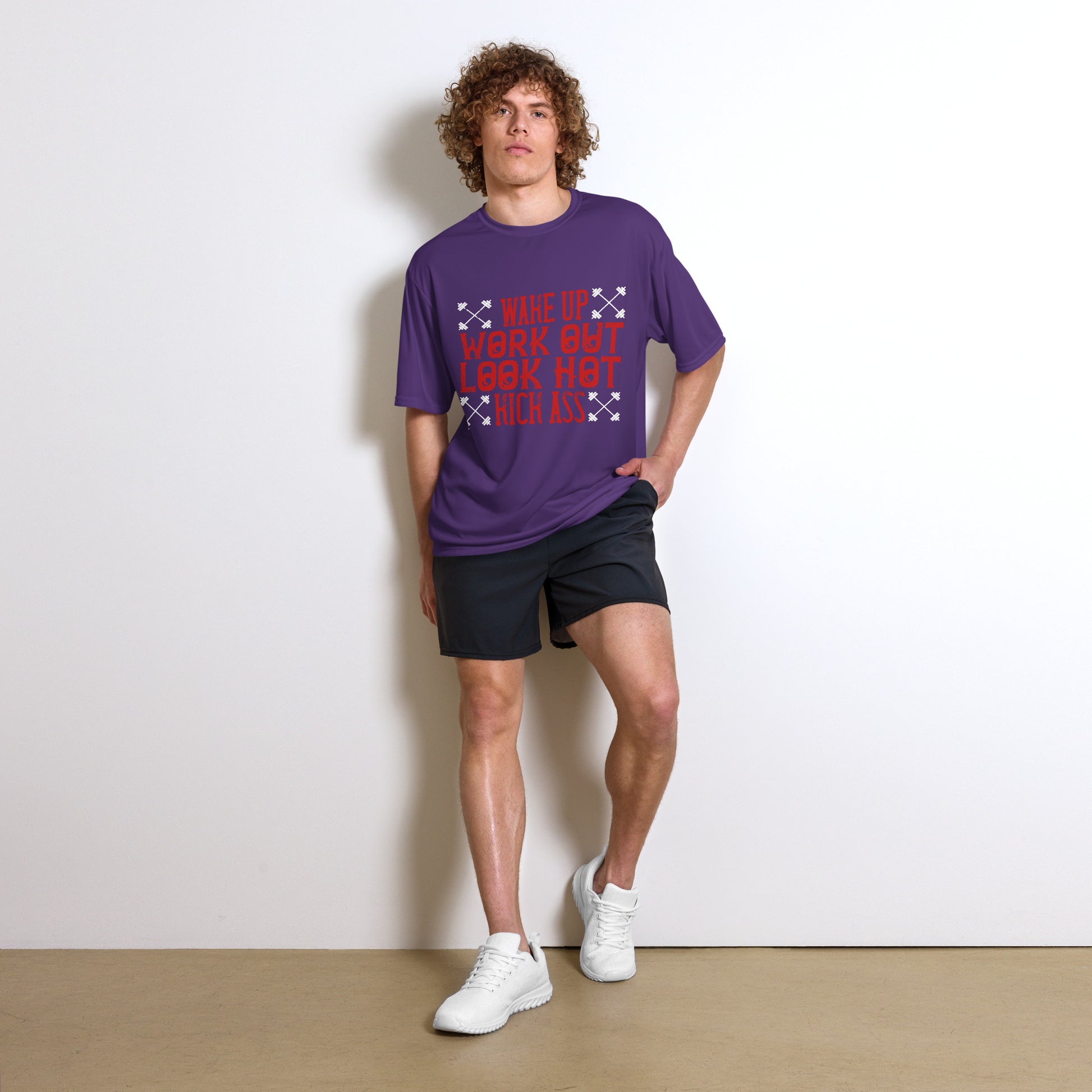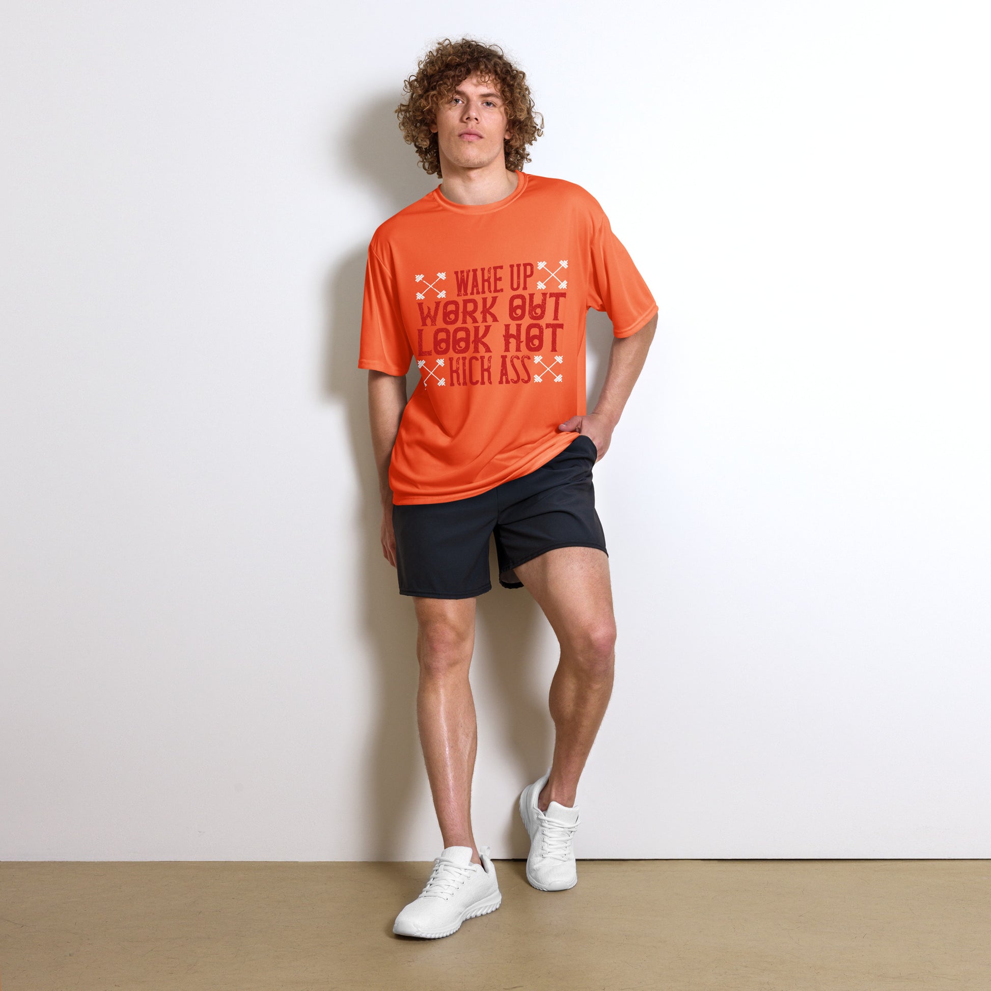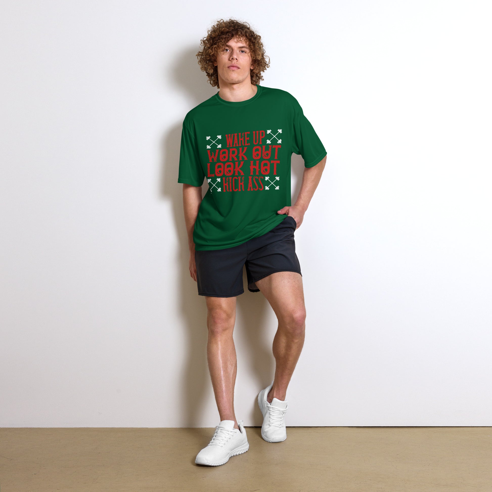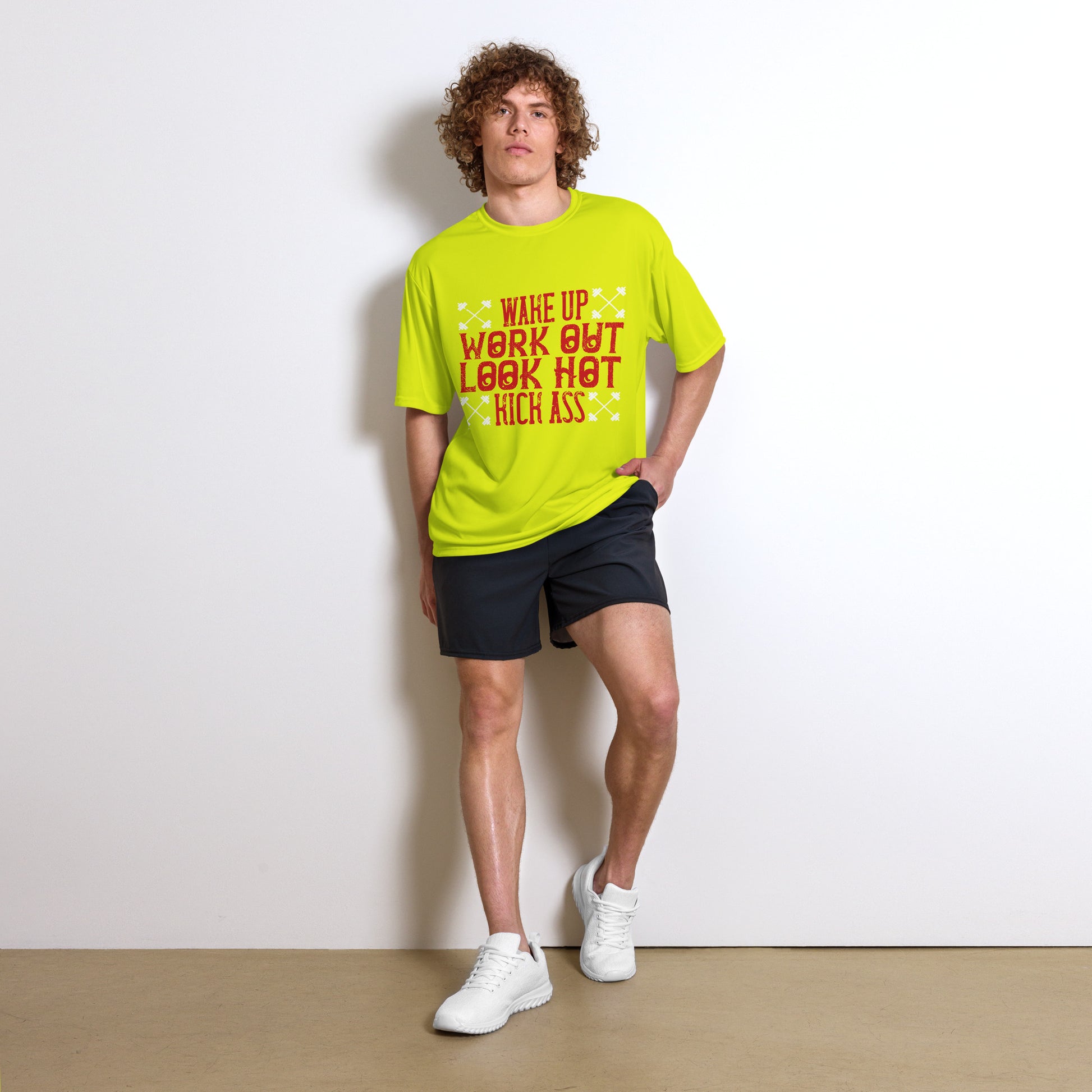 Power up your daily mantra with the "Work Out, Look Hot" Performance T-Shirt, a bold statement piece that lays out the blueprint for success: "Wake Up, Work Out, Look Hot, Kick Ass." Each word is a step on the staircase to your best self, etched in a font as fierce as your determination and in colors that pop against the sleek black background. This t-shirt isn't just for wearing—it's for declaring a lifestyle, a battle cry for those ready to take on the day with sweat, style, and swagger. Made for the movers and shakers, the trendsetters and the record breakers, it's your uniform for victory. Whether you're crushing it at the gym or conquering the concrete jungle, this tee is your ally, making sure you're not just going through the day—you're owning it. Stay cool, dry, and confident even during the most intense activities in this unisex performance crew neck t-shirt. Made from premium, moisture-wicking fabric with odor resistance, stain release, and UV protection, this shirt’s perfect for going to the gym, playing sports, hiking, or any other activity.